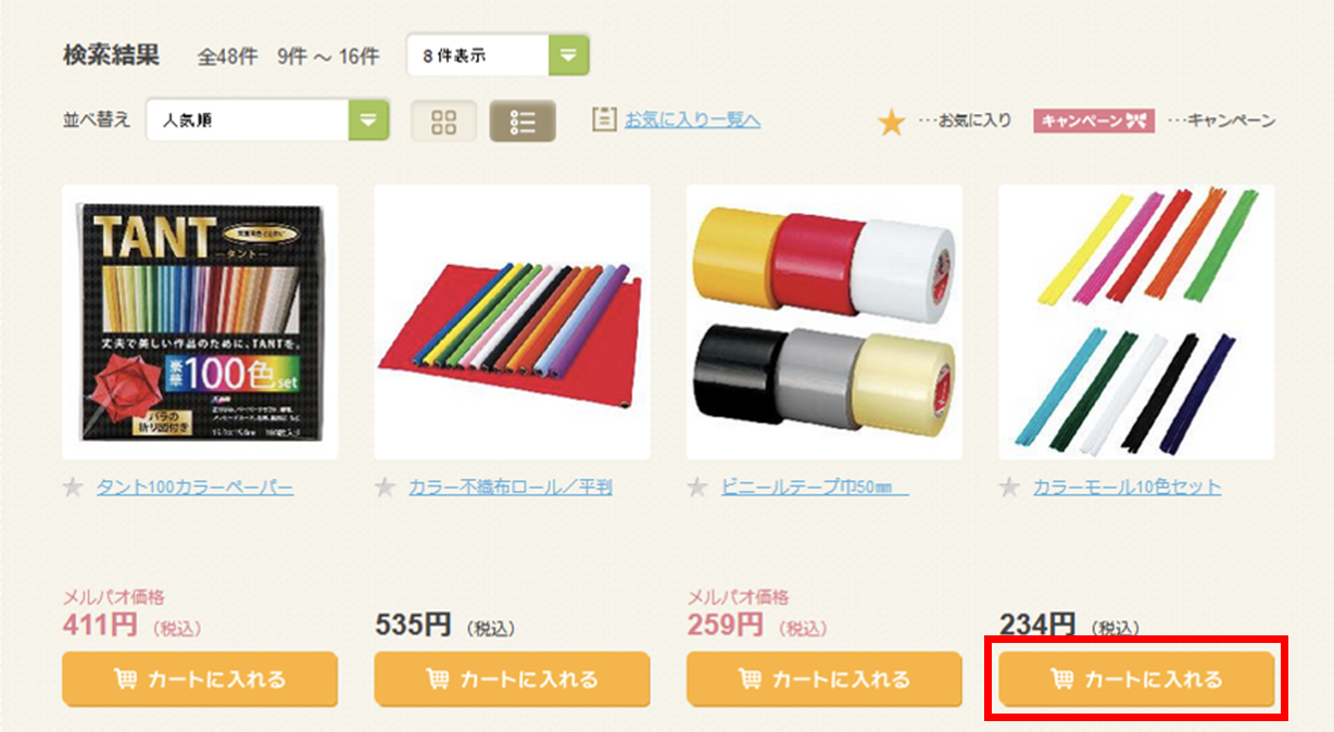 ①商品を選び、「カートに入れる」ボタンをクリックするとカートの中に商品が入ります。