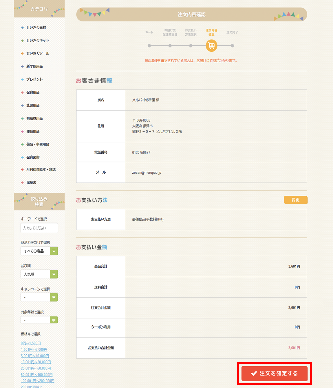 ④ご注文内容に間違いがなければ「注文を確定する」ボタンをクリックするとご注文は完了です。