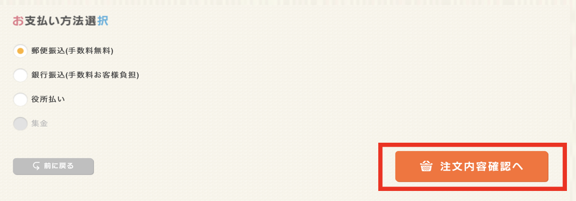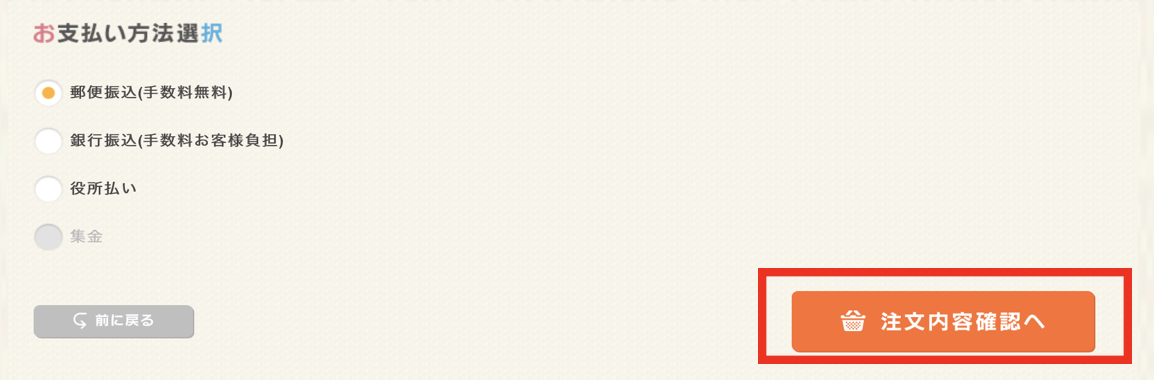 ③お届け先や、お支払い方法を選択後「注文内容確認へ」ボタンをクリックしてください。