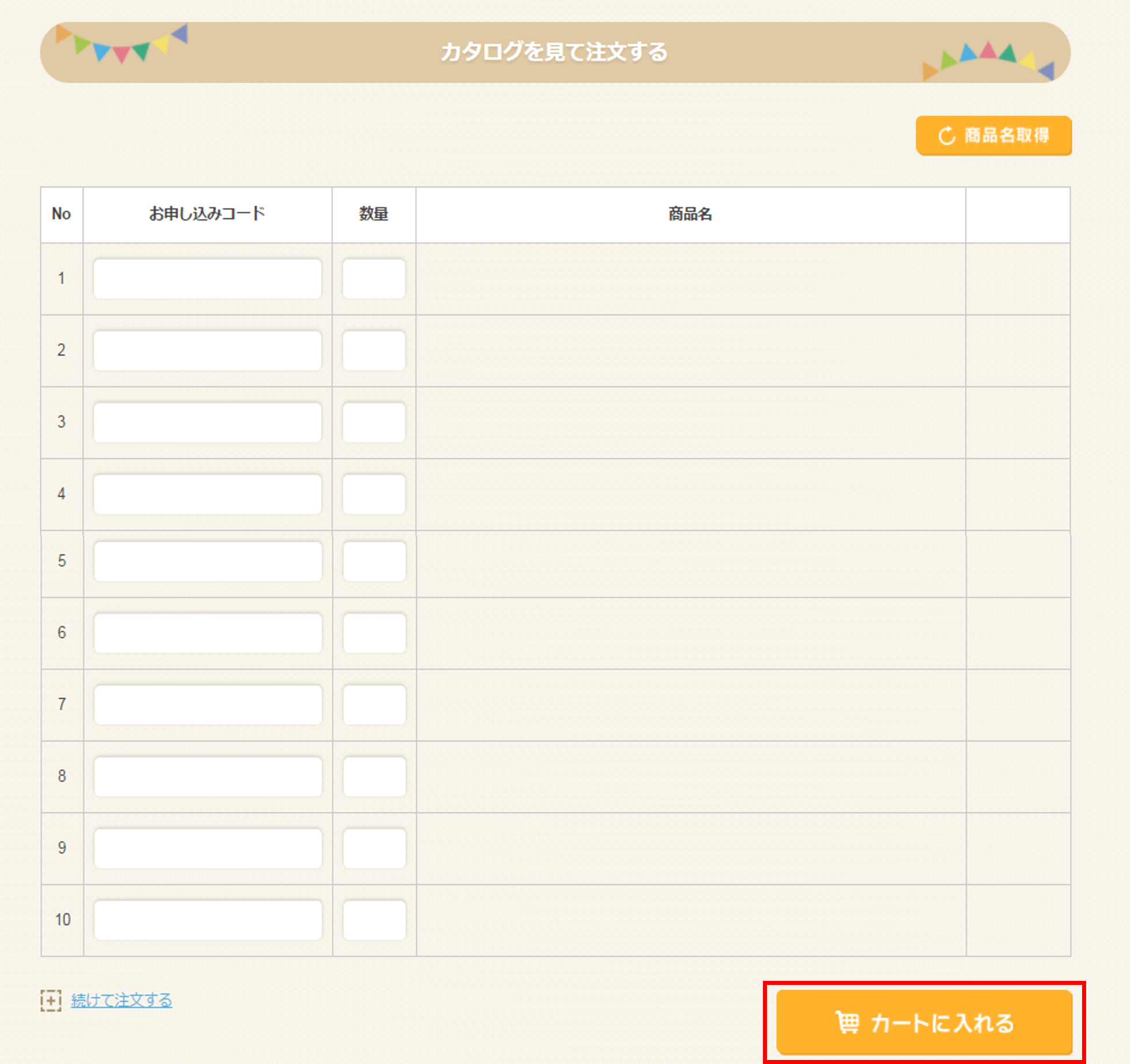 ①7桁のお申込コードを入力すると、商品名が表示されますので、商品を確認後数量を入力し、「カートに入れる」ボタンをクリックするとカートの中に商品が入ります。