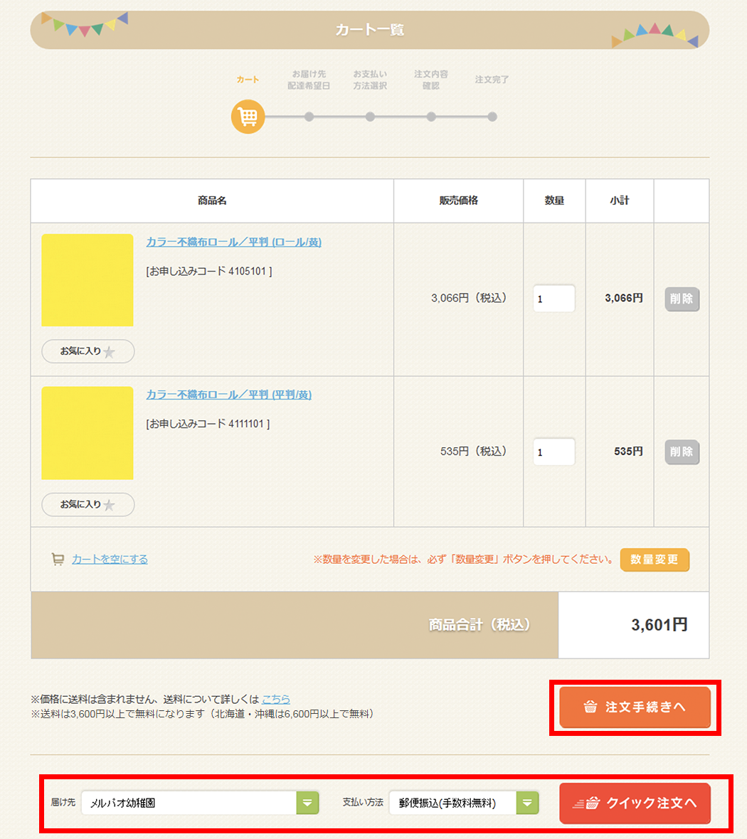 ②商品名・数量を確認し、カート一覧の下にある「注文手続きへ」ボタンをクリックしてください。