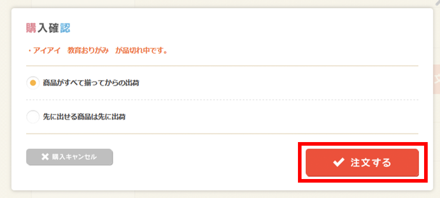※「注文を確定する」ボタンをクリックした際「○○が品切れ中です。」とメッセージが出た場合は、「商品がすべて揃ってからの出荷」か「先に出せる商品は先に出荷」のいずれかを選択してください。選択された出荷方法または、お支払い方法によってはご指定の日時にお届けできない場合があります。選択後に「注文する」ボタンをクリックするとご注文は完了です。