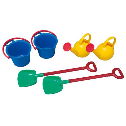 シャベル、バケツ、ジョーロ各2個をセットにしたコンパクト砂遊びセットです
